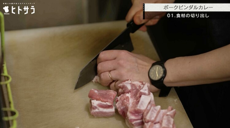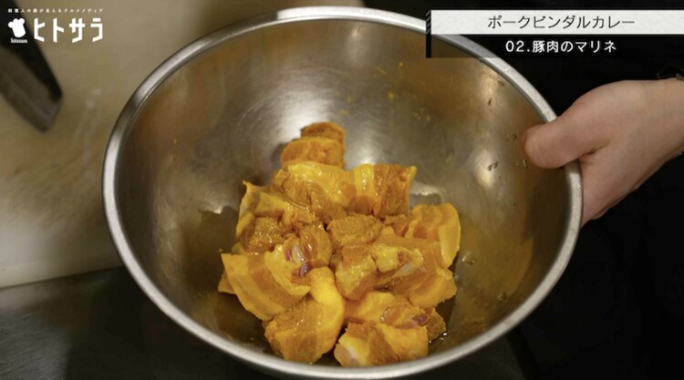 切った豚バラ肉にターメリックパウダーで下味をつけます。均等にまぶせたら白ワインビネガーを入れて揉み込み10分以上漬け込みます。漬け込む時間が長いと肉から水分が出てくるので、一番最初に準備しておくのがオススメです。