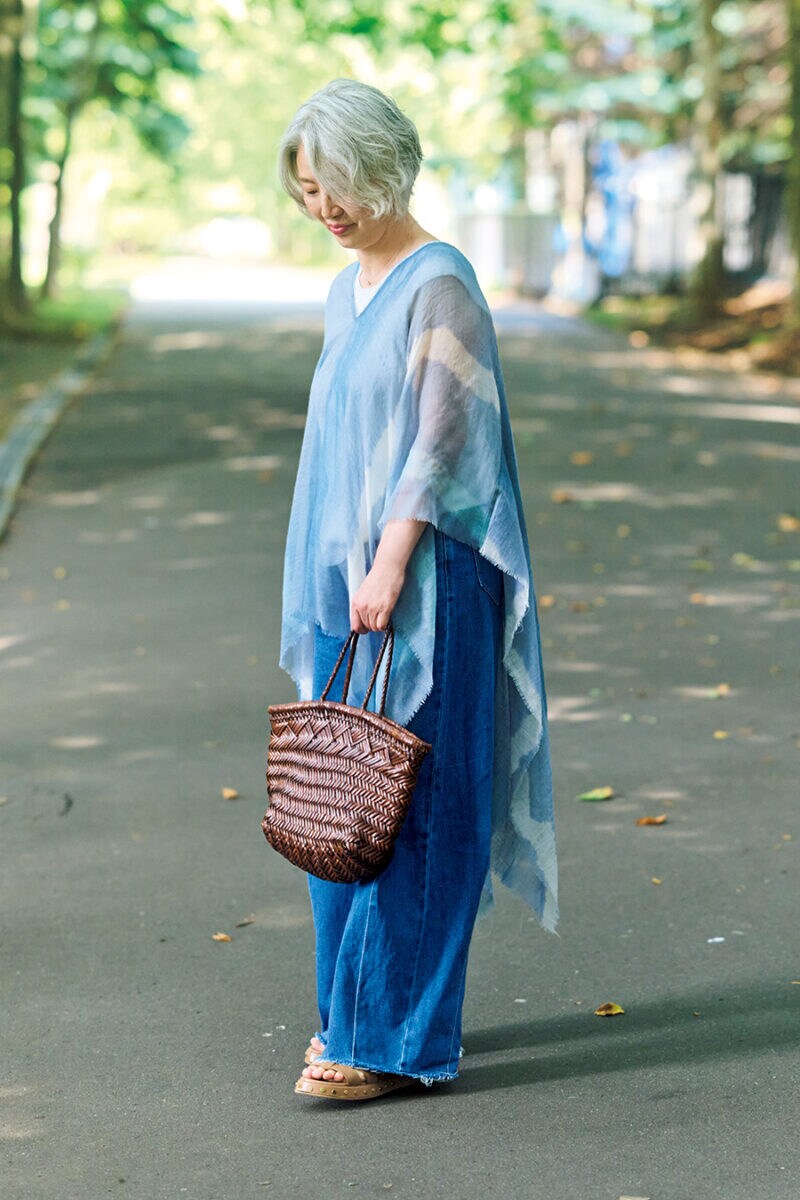 夏は透け感がきれいなポンチョ、秋は、バルーンスリーブのジャケットで、同じ色合いのコーデでもイメージチェンジ。