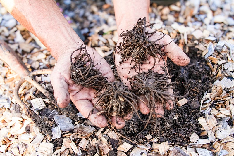 【手順3】根株や球根を鉢に入れ、肥料を混ぜておいた土を周りの隙間に入れるだけで完了です。茎や葉の部分が土の中に埋まってしまうと、灰色かび病などの病気の原因になるので、深植えにならないように注意しましょう。