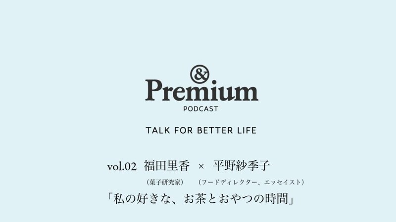 聴く『&Premium』の第2話は、2025年10月13日にマガジンハウス80周年を記念した「マガジンハウス博」(@Ginza Sony Park)で行われた&Premiumのトークイベントを公開収録した模様をお届け。菓子研究家・福田里香さんと、フードディレクター、エッセイストの平野紗季子さんによる「私の好きな、お茶とおやつの時間」にまつわるスペシャルトークです。お互いのお茶の時間や好きなおやつの話から、もしも二人で店を出すならどんな店にしたいかまで、夢が詰まった楽しいトークが繰り広げられました。「everytime is tea time」、「ミニャルディーズは終わらない夢」、「お菓子は娯楽」など、おやつ好きにはたまらないフレーズも必聴です。ぜひ、お茶の時間のおともに聞いてみてください。