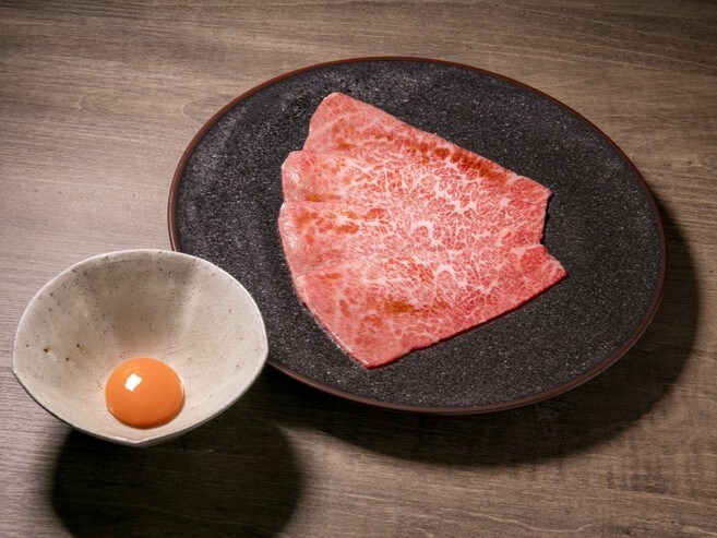 希少部位「ザブトン」を使った『ザブトンのすき焼き 徳島県産あわそだちと一口ご飯を添えて』は、A5黒毛和牛の旨みを堪能できる看板メニュー。濃厚な卵黄に絡めれば、まろやかで深い味わいに。肉でご飯を巻く、卵かけご飯にするなど、多彩な楽しみ方ができる贅沢な一皿です。