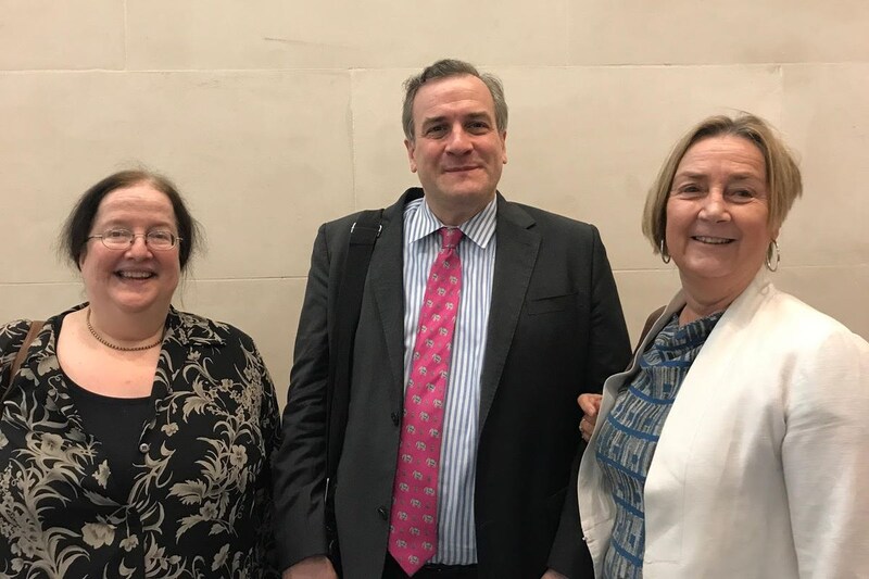 右から、ゴヴィエ氏、カーペンター博士、サラ・トンプソン博士(ボストン美術館 テリー&ブラッドリー・ブルーム日本版画キュレーター)。日本人研究者の久保田一洋氏と並び、ゴヴィエ氏が敬愛する2人だ。トンプソン博士は、ゴヴィエ氏のために何時間も割いて、ボストン美術館所蔵品の応為作の可能性を検討してくれたという。ただ、大筋で合意はしても、学術的に作者を変えるのは簡単ではないと、ゴヴィエ氏も言う。(2017年に大英博物館での北斎シンポジウムにて筆者撮影)