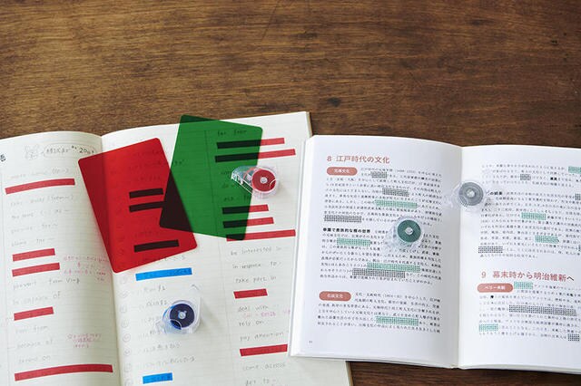 [暗記用グリーン]は、隠蔽性の高い白フィルム+カモフラージュ柄なので、暗記したいワードに引くだけで赤シートを使わずにワードを隠して暗記学習ができる。覚えたワードや理解できた部分のラインをはがしていくことで、いま現在の習得状況に対して必要なラインだけが紙面に残り、集中して学習することができる。