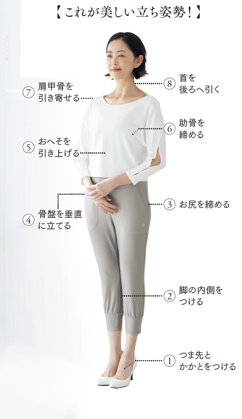 立ち姿は足元から作るため、①から⑧へと意識しながら整えていきます。