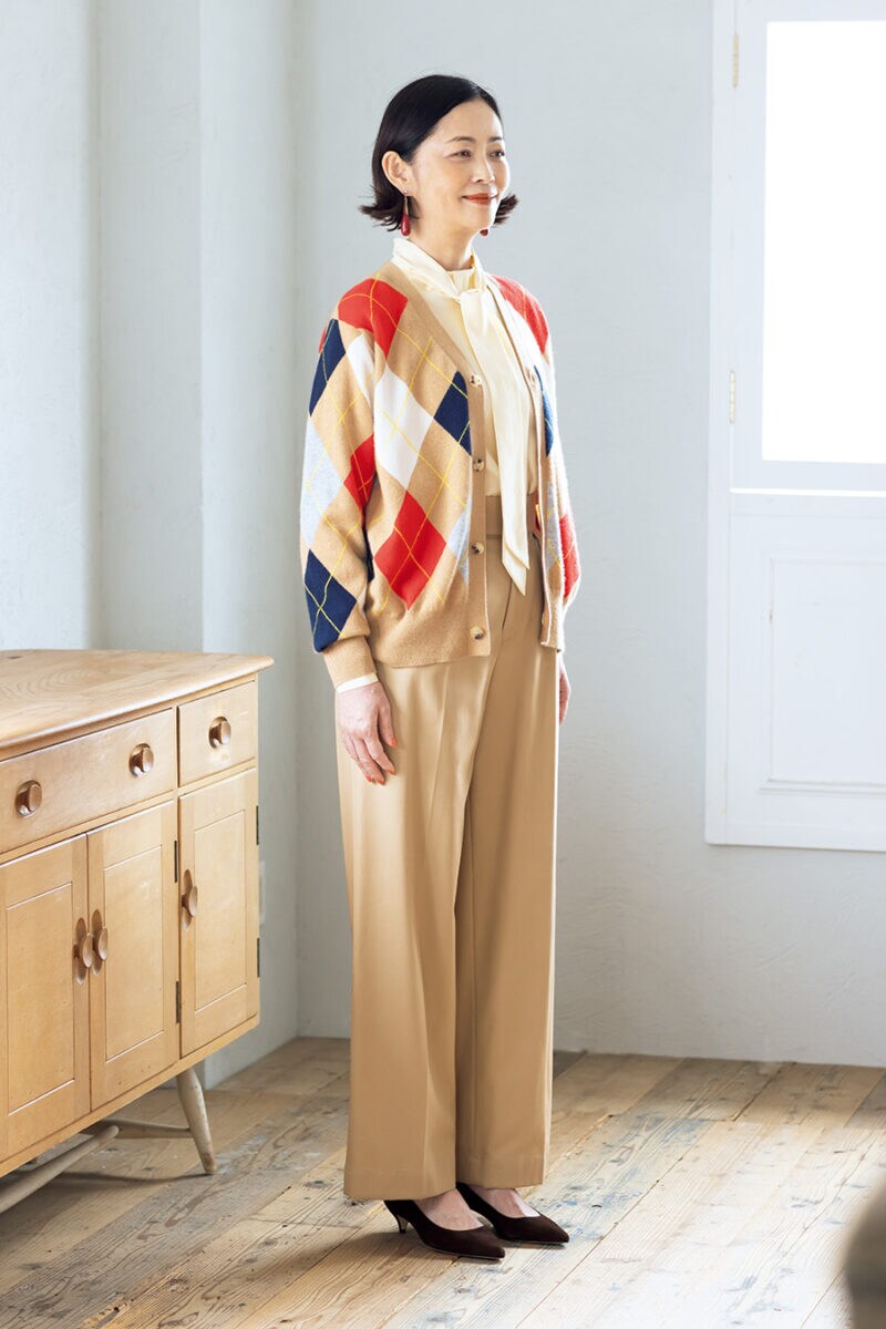 カーディガン¥55,000/マカフィー(トゥモローランド)、ブラウス¥23,100/ソージュ(ソージュ オンラインストア)、パンツ¥36,300/タンジェント(ザ エディット ストア)、パンプス¥64,900/ネブローニ、イヤリング¥9,720/アビステ