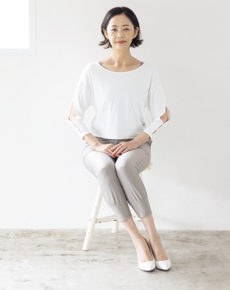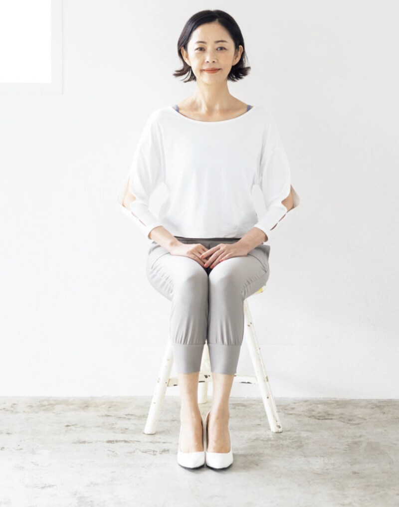 下の画像の座り方が無意識にできるよう、コツコツと継続して取り組みましょう。基本の座り方をマスターしたら、より美しく脚が長く見える応用編へ。