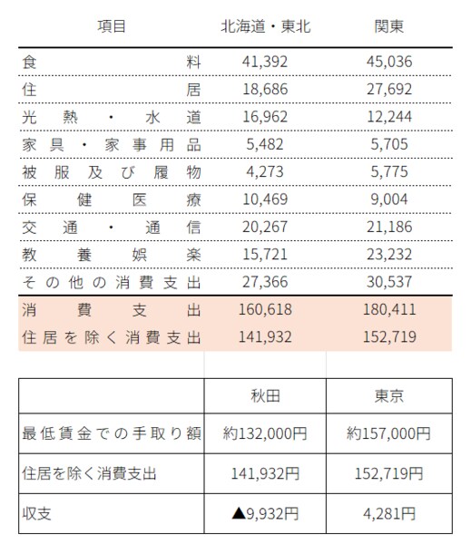 この調査で特徴的なのは、最低生計費に都市部と地方でほとんど差がないという点です。例えば、東京と秋田で試算を比較すると、東京は家賃が高い一方で公共交通機関が発達しているため交通費は安く済みます。