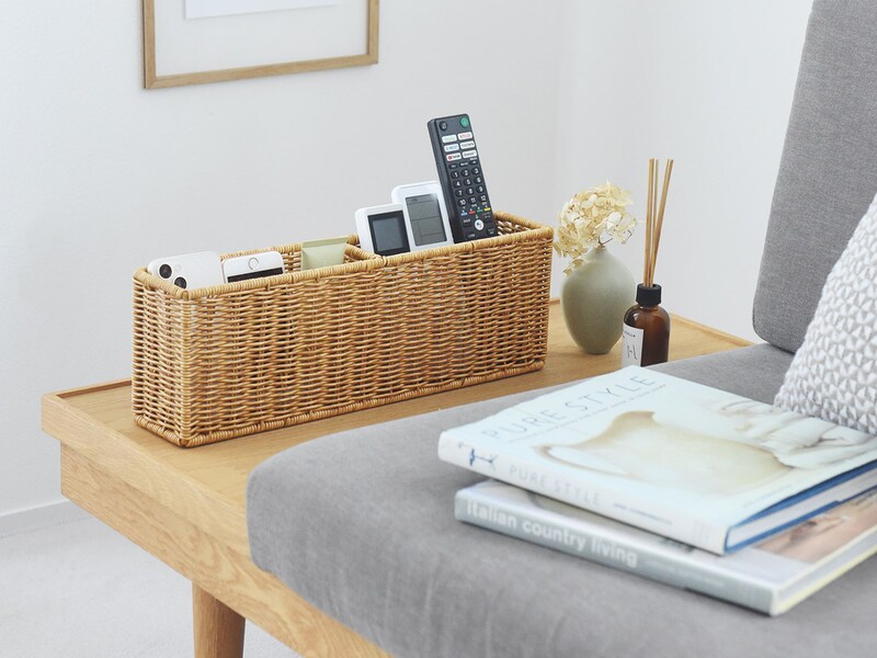 【ご紹介したアイテム】 見た目は天然のラタン素材のようでありながら、水や汚れに強い素材で作られているUTILE(ユティル)の収納アイテム。こちらはリビングのリモコンやスマホなどの収納にぴったりなマルチケースです。