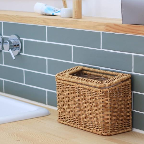 【ご紹介したアイテム】 見た目は天然のラタン素材のようでありながら、水や汚れに強い素材で作られているUTILE(ユティル)の収納アイテム。洗面所でのコットンや綿棒、ティッシュなどをポンと気軽に捨てることができる卓上ゴミ箱です。