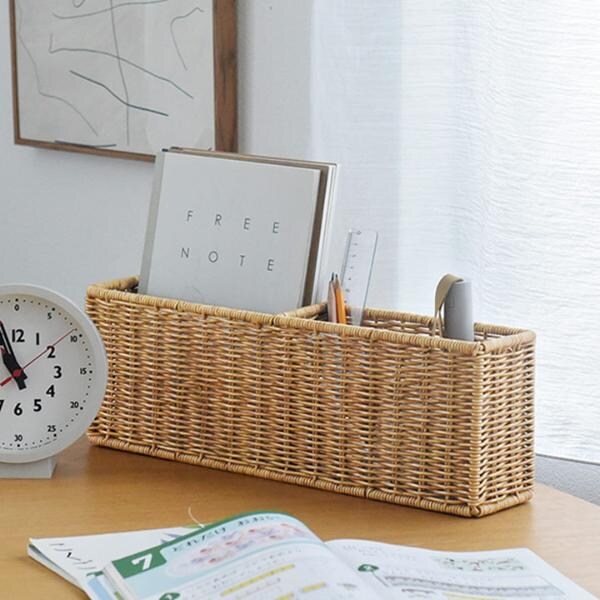 【ご紹介したアイテム】 見た目は天然のラタン素材のようでありながら、水や汚れに強い素材で作られているUTILE(ユティル)の収納アイテム。こちらはリビングのリモコンやスマホなどの収納にぴったりなマルチケースです。