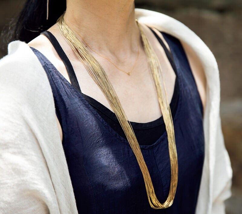 細いビーズが贅沢に連なった存在感ある30連のビンテージジュエリーと「ミッタン」のショールで大人度アップ。