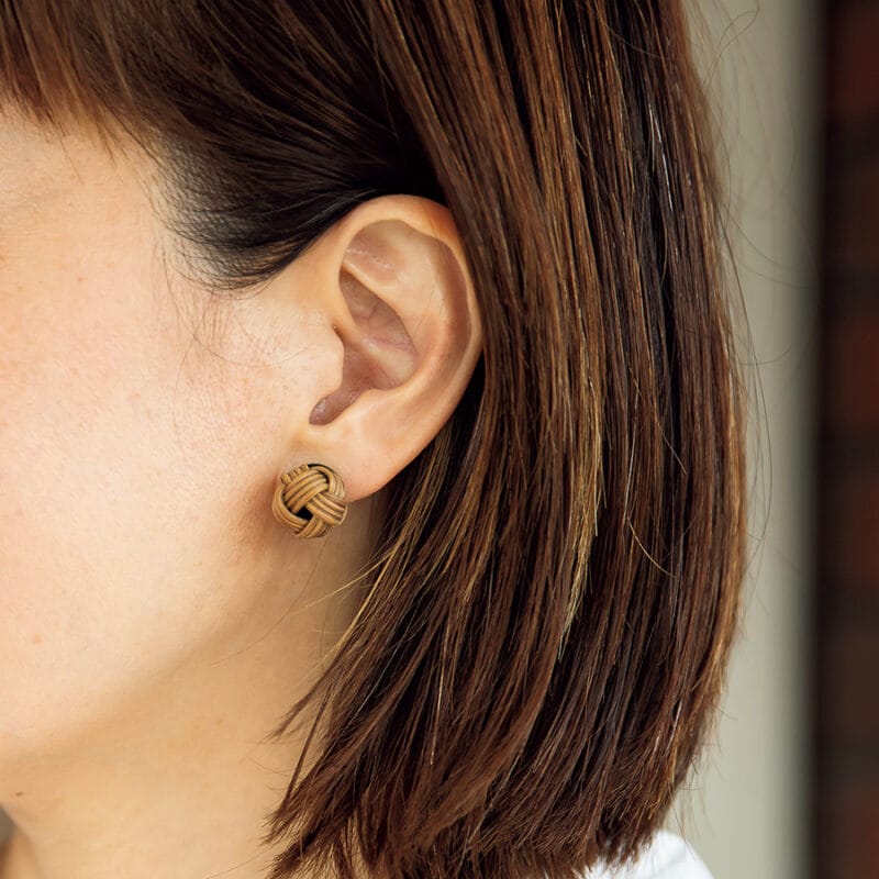 ラフィアのバッグに合わせてピアスもナチュラルな素材のものをチョイス。