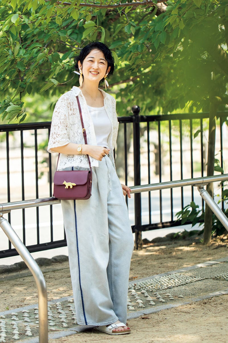 バッグは「メゾン N.H.パリ」、サンダルは、注目を集める竹ヶ原敏之介氏の「ビューティフルシューズ」で。