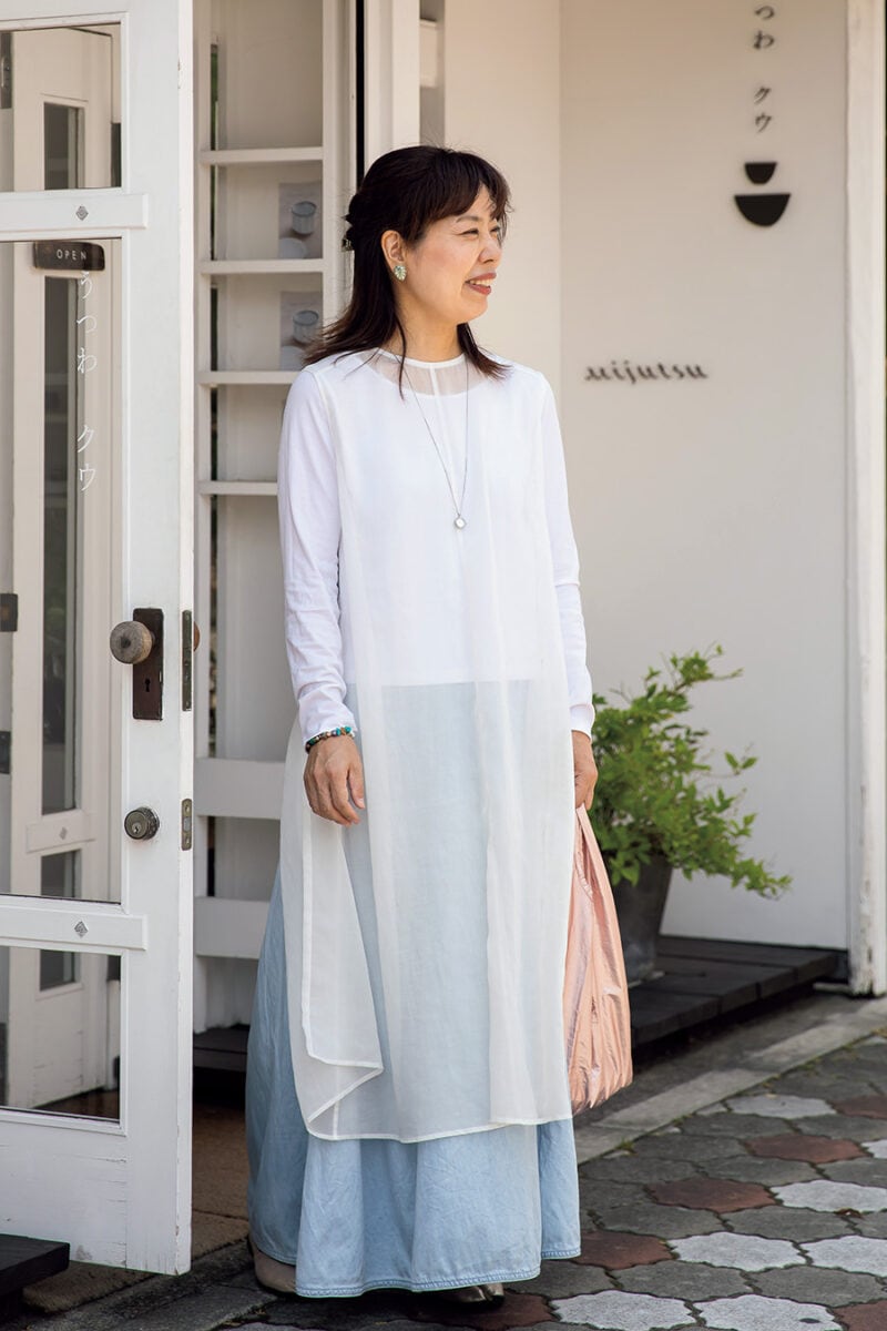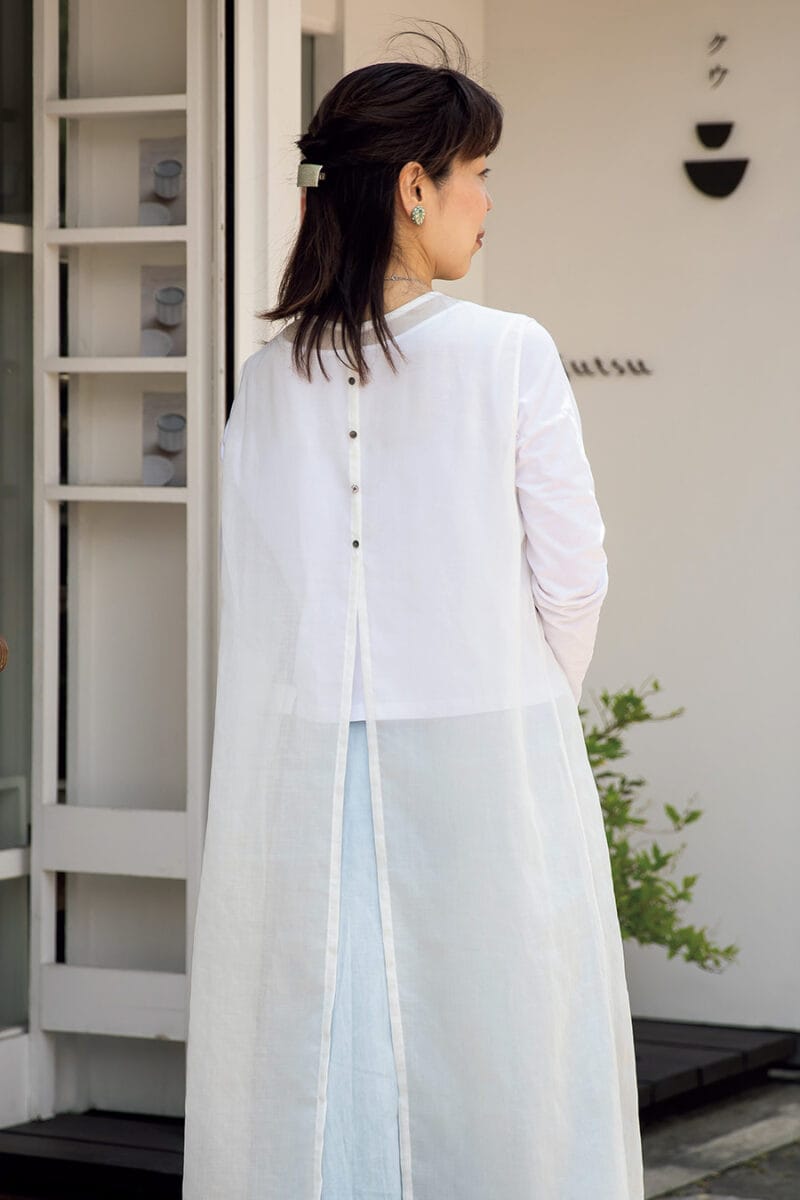 「羽織るだけで素敵に見せてくれる」シアーなロングブラウスは「カリテ」。