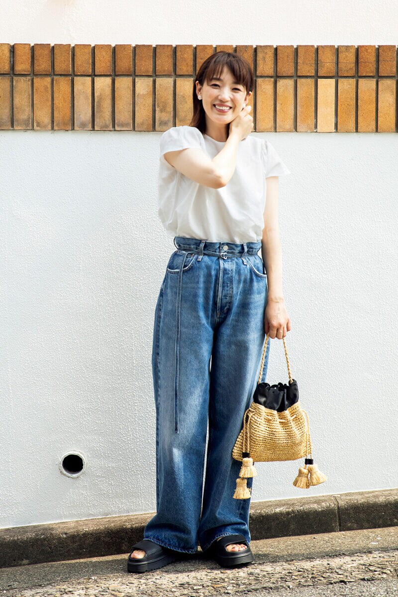 「ヒュイ」の大ぶりのイヤリングがこの日の主役。ウエストタックのゆったりデニムは、両脇の黒ラインで脚長効果も。「ウエストも黒のサテン地で品よくまとまります」