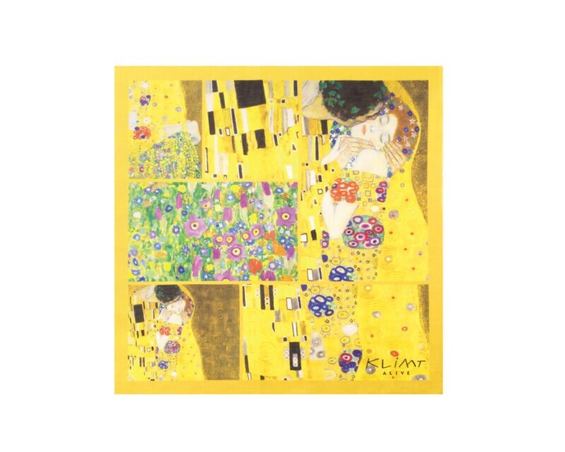 ハンカチとして使ってよし、ファッションに取り入れてよし、額に入れて飾ればインテリアにもなる艶やかな大判ハンカチ。金をふんだんに使用した豪華絢爛な作品や人物画のイメージが強いクリムトですが、実は風景画も多数残されており、その部分がコラージュされているのも印象的。