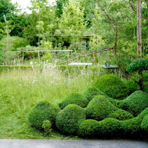 イチイや、ツゲなど、ヨーロッパの庭園特有の構造性に、日本の刈込が生み出す自然な景観を取り入れた、いわば「オーガニック・トピアリー」。庭全体に、規則的な形を散りばめ、奥行きを演出して空間を広く感じさせることを意識しています。