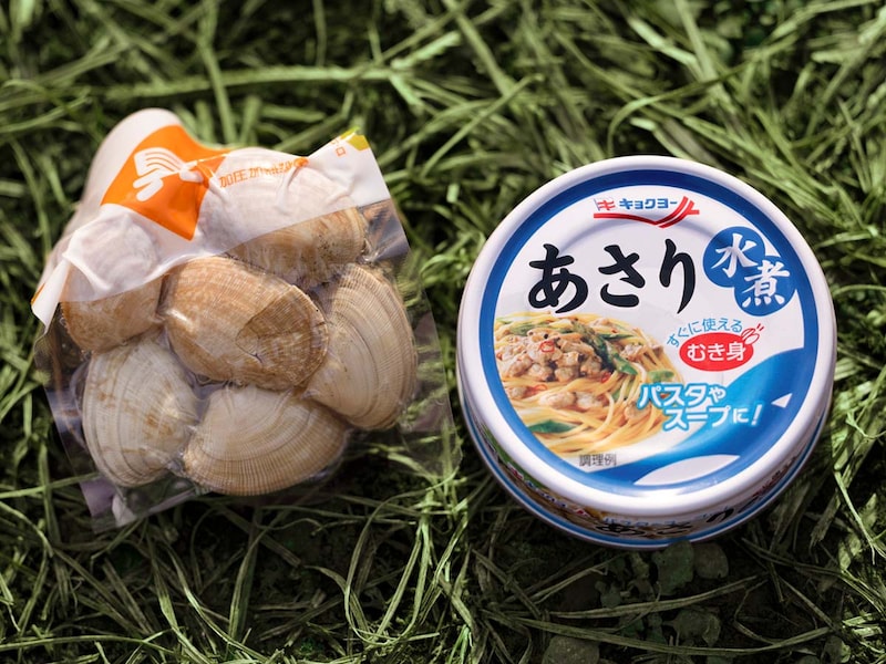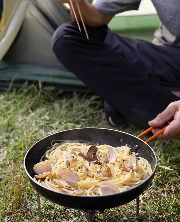 アサリのむき身水煮缶は、キャンプ料理の食材としてお馴染みの人も多いはず。それに加えて僕がおすすめしたいのが、インスタント味噌汁についてくる真空パックの殻つきアサリ。これを使えば、ボンゴレスパゲティも一気に本格派なご馳走に格上げしますよ!(小雀さん)