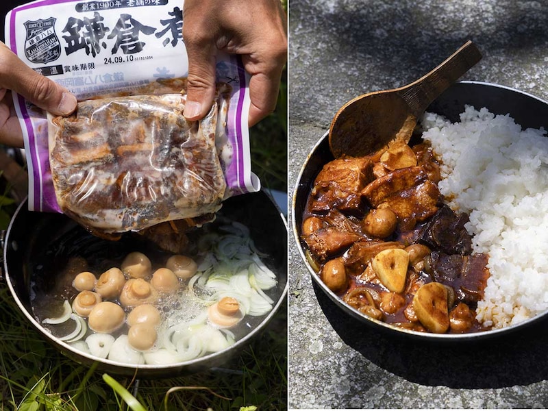 カレーはキャンプ飯では間違いのないメニュー。中でも、食べ応えのあるゴロゴロ肉がたっぷり入った豚バラカレーは最高! でも生肉は保存が効かないのが難点。そこでおすすめなのが「豚角煮のレトルト」(写真左)。味つき肉のおかげで、カレーの風味に奥行きも出て一石二鳥です。