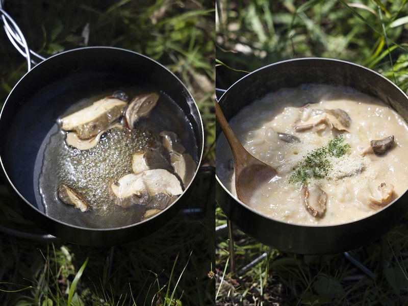乾燥しているので日持ちがよく、軽くて持ち運びも便利な「ドライポルチーニ」。クリーム系との相性が抜群なので、リゾットにするとおいしい。戻すときはお湯でじっくり戻して香りを引き出そう(写真左)。ご飯はコンビニなどで売っている「塩おにぎり」を使うと手軽に作れますよ。
