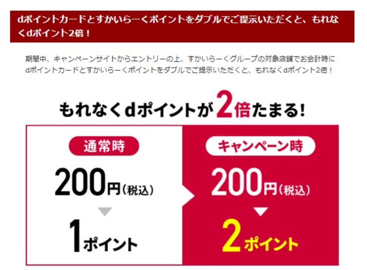 参加対象は、事前にキャンペーンにエントリーした上で、店頭で「すかいらーくポイント」と「dポイント」の2つを提示し、dポイントを1ポイント以上貯めた人です。すかいらーくグループでは通常、税込200円につきdポイントが1ポイントがたまりますが、キャンペーン期間中はもらえるdポイントがもれなく2倍に!税込200円につきdポイント2ポイント(通常ポイント1ポイント+キャンペーンポイント1ポイント)がたまります。