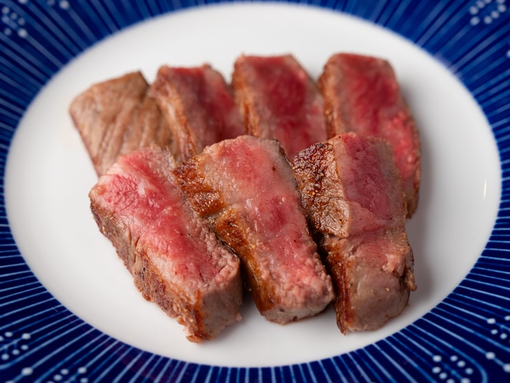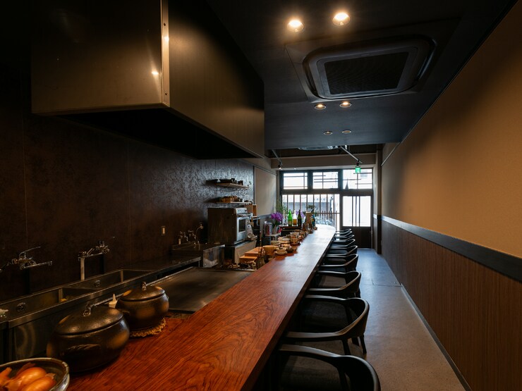 和の風情が漂う扉を開けると、中はカウンター12席のみの隠れ家のようなシックな空間が広がっています。ブビンガ材を使用したカウンターは木目が美しく、温もりを感じる風合い。肩肘張らずにくつろげる雰囲気で、大人のデートにもぴったりです。店主が厳選した国産自然派ワインを傾けながら、飛騨牛を満喫しましょう。