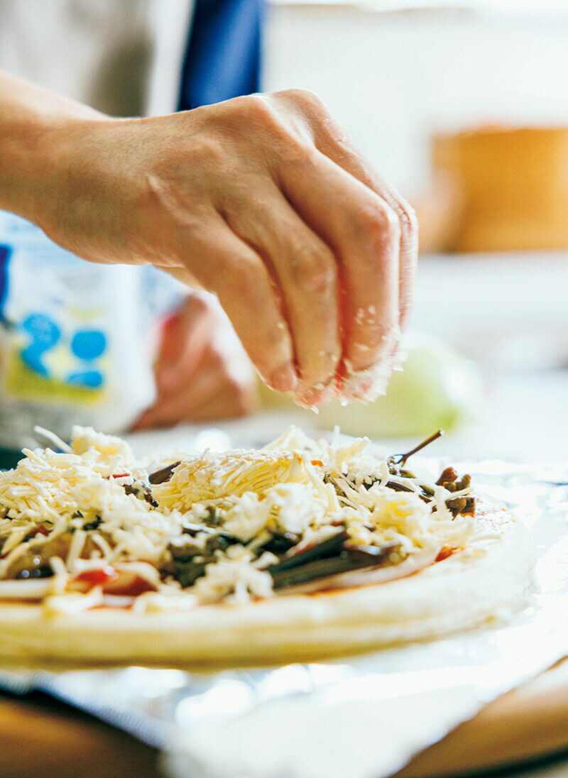 梅しょうゆに漬けたわらびを使ったピザ。石窯で焼き上げます。