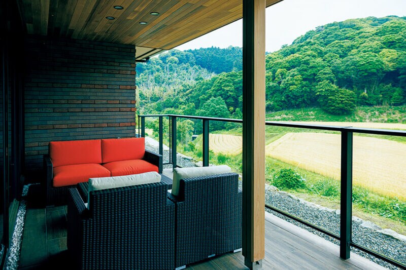 テラスからは山と大豆畑、小川の静かな景色が広がる。