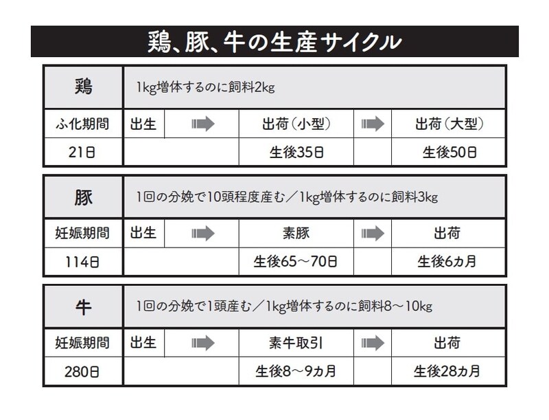 注目するべきは、「飼育期間」と「飼料の量」です。じつは鶏、豚、牛のそれぞれの生産サイクルを知ると、なぜ高価になるのかが簡単に理解できるようになります。それぞれの出生~出荷にかかる日数、体重を1㎏増やすのにかかる飼料の量を比較してみましょう。
