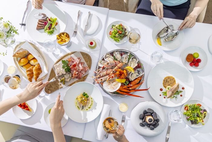 コンラッド東京からは、新しい発見と驚きに満ちた料理を研究し続けるモダンフレンチ「コラージュ」より、土日限定の「コラージュ・ウィークエンドブランチ」にご招待。シェフ特製岩手県産白金豚のパテ・ド・カンパーニュや滋賀県産近江鴨の燻製(くんせい)鴨(かも)ハムをはじめとする彩り豊かな前菜をビュッフェで好きなだけ、メインは国産のこだわり食材を使用した料理から選ぶことができる。季節のデザートもビュッフェスタイルで。今回は特別に、コンラッド東京のソムリエチームが選ぶシャンパーニュ1種のフリーフローを付けてご用意。高さ7mの窓から望む汐留のダイナミックな景色を開放的な空間で、大切な方と上品な週末のひとときを楽しんで。