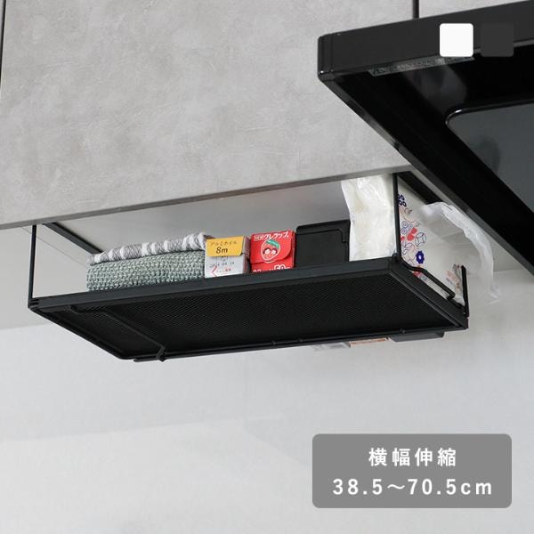 戸棚下にプラスワン、伸びて吊るせる収納ラック。玄関や洗面所、台所などの戸棚下に吊るすだけで新たな収納スペースを確保。高さで選べる2サイズ展開です。