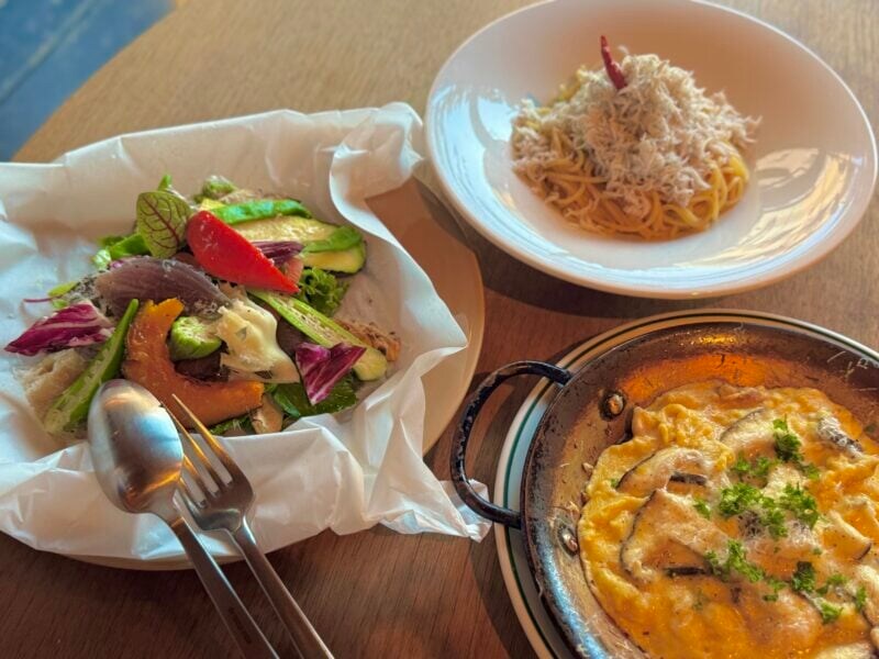 「何を召し上がったかで、お越しになられた季節がわかります」というほど旬の野菜を詰め込んで焼き上げた看板メニューのグリルサラダのほか、ごくわずかしか流通していない和歌山県唯一の地鶏「龍神コッコ」のたまごを使ったオムレツ、大人気のしらすのペペロンチーノをオーダー。
