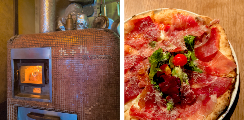 お店の奥には窯がしつらえられており、ナラの木の薪でピザなどを焼き上げています。生ハムたっぷりのピザをいただきました。イチボのステーキや冬にはジビエも窯焼きで供しているそう。