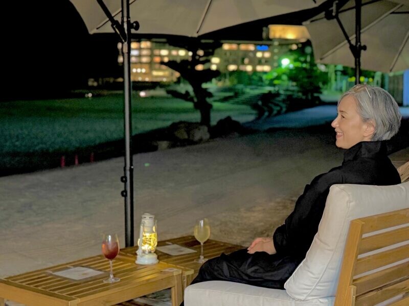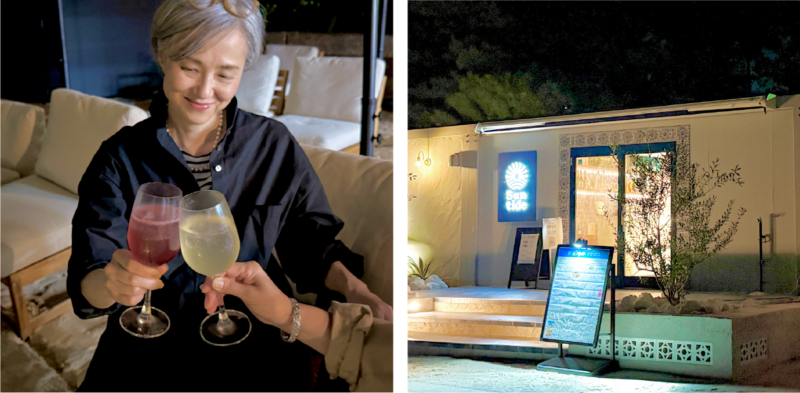 「楽しかった〜! 今日行ったところ、またゆっくり来ようね」と乾杯するおふたり。テラス席のほか、ガラス張りの店内からも海を眺めることができるニュースポットは、大人がナイトタイムを過ごすのにぴったり。