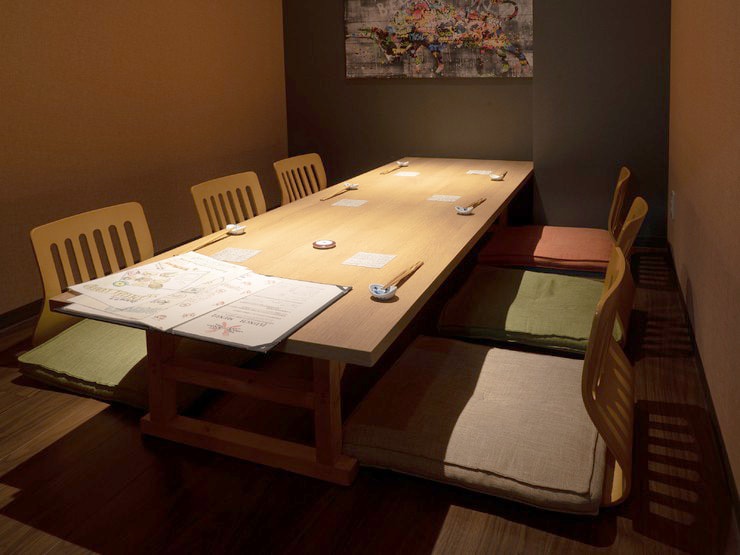 店内はどこか懐かしさを感じる、民芸調の設えになっています。気軽に飲みたいときにぴったりなカウンター席や、ゆったり座れるテーブル席のほか、周りに気兼ねせずに過ごせる完全個室を用意。10名まで利用可能なテーブル個室もあります。飲み放題付きのコースもあり、友人との気軽な飲み会にオススメです。