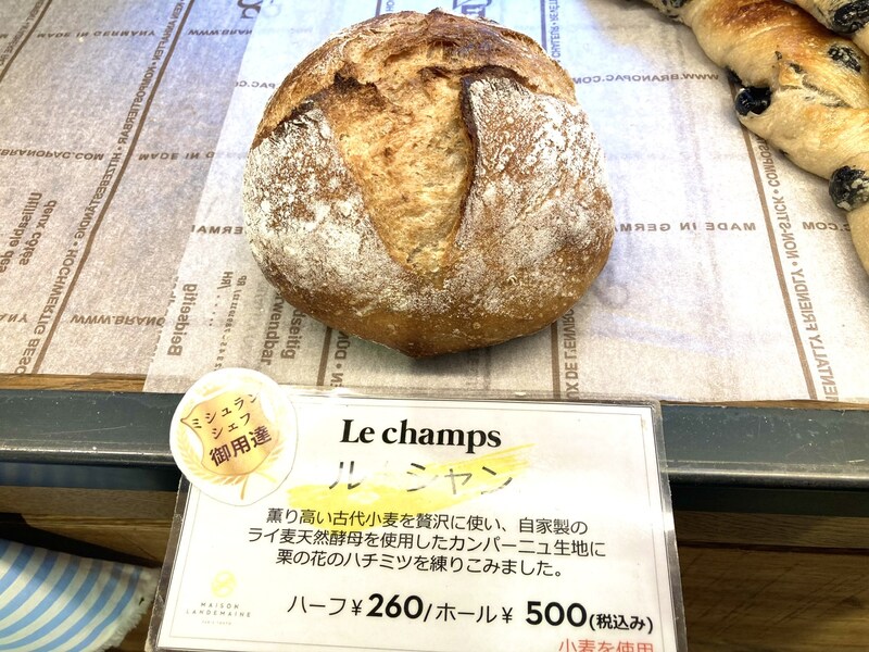 他には古代小麦を使ったカンパーニュ生地に、栗の花の蜂蜜が練り込まれた「ル シャン」です。こちらのパンは外資系ホテルでも使われていて好評です。(筆者注:リベイクすると栗の花の蜂蜜が華やかに香る、絶品でした)