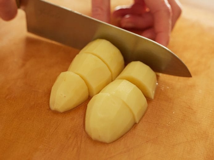 <point>しっとりしたコロッケに仕上げるために、メークインを使用。じゃがいもは小さく切ると旨味が逃げてしまうので、大きめに切りましょう!