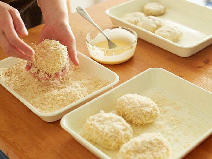 6.バッター液とパン粉をしっかりとつける:パン粉がついていないと爆発の原因に。