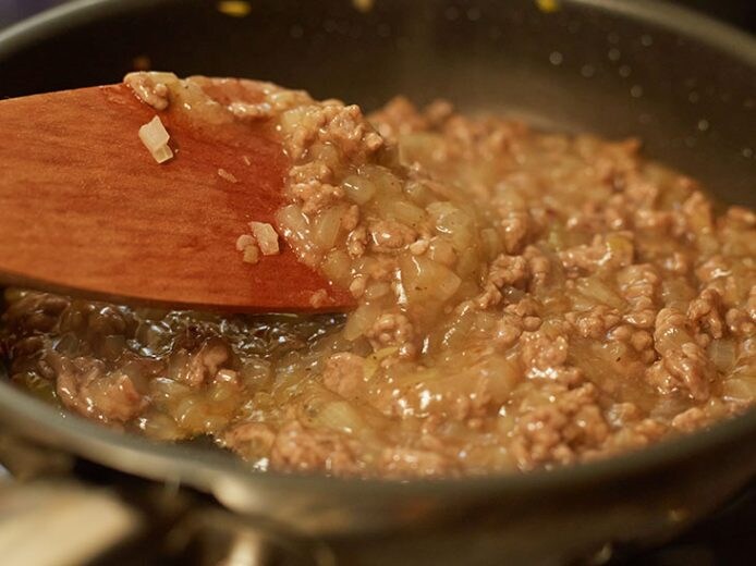 4.フライパンに油を熱し、玉ねぎを中火で炒める。透き通ったらひき肉を加えて炒め、火が通ったらAを加えさっと炒め、混ぜ合わせたBを加えとろみをつける