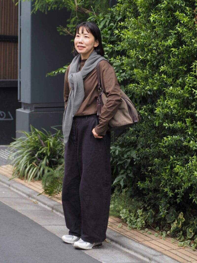 トレンドや着こなし方などに精通しているスタイリストのKさんは、色みや小物使いで秋らしさを表現。取り入れるだけで今っぽさが増すブラウンのトップスをはじめ、こっくりしたカラーアイテムをちりばめることで、秋のカジュアルコーディネートが完成!