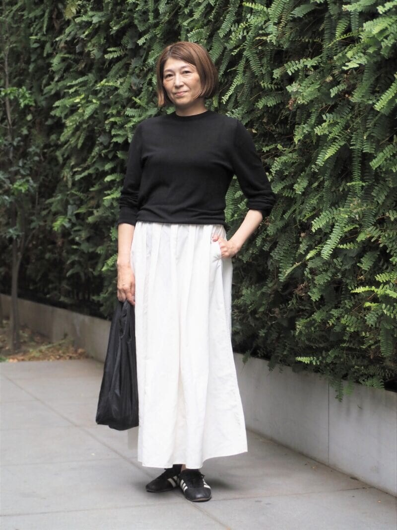黒と白のコントラストにパッと目が行くモノトーンスタイル。さりげなく透け感のあるコンパクトなニットと、光沢のあるロングスカートはどちらも「ザラ」で購入したのだとか。トップスをウエストインすることで、さりげなくスタイルアップ!