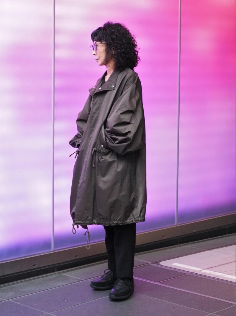 ブラックでまとめたスタイリッシュな装いに合わせたのは、「カスタネ」のモッズコート。軽やかなナイロン素材と今っぽいボリューム感がおしゃれ。小柄なHANAさんがオーバーめに羽織ると、ワイルドなギャップを演出。パーマヘアとの相性も◎。