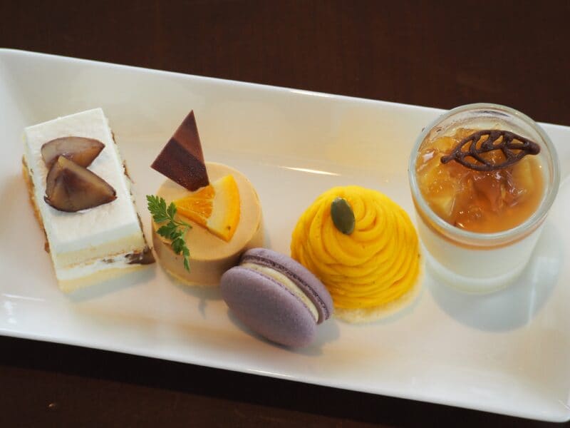 上段には5種類のスイーツがずらり。黄色、紫、茶色など、秋を感じるカラーリングで彩られた一皿を前に、早くもテンションが上がります。