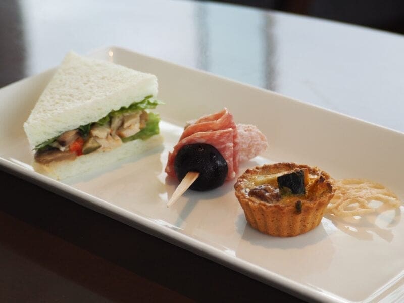 4種のきのことスライスチキンを和風テイストに仕上げたサンドイッチ、チーズを使用した季節野菜のタルトは満足感たっぷり。箸休めとしていただいたピンチョスは、ハムの塩味とオリーブの酸味と干し柿の甘さが絶妙です。甘いものとしょっぱいものを交互にいただき、私の食欲はもう止まりません……(笑)。