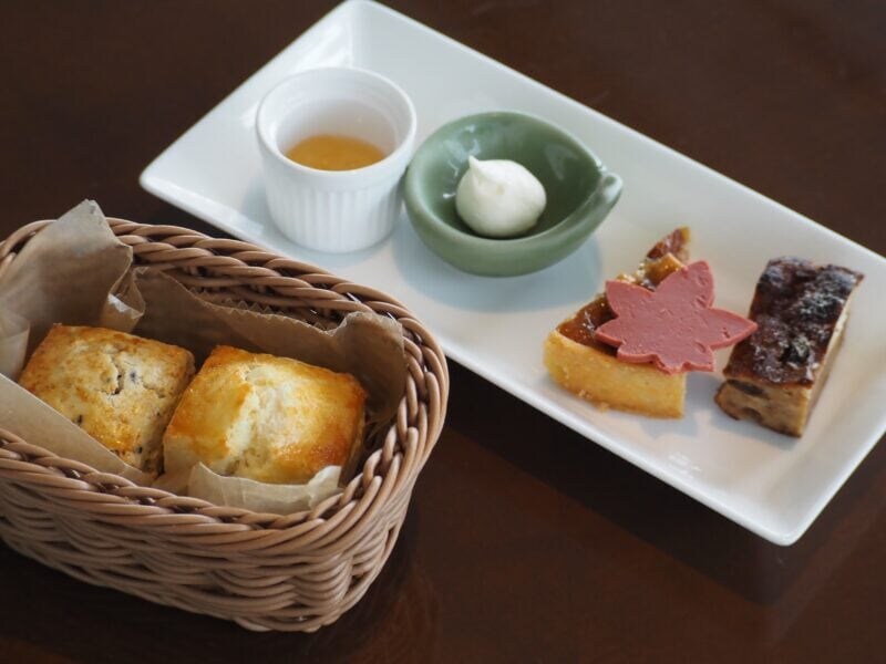 旬のりんごとレーズンの果汁がジュワッとあふれるパンプディング、ミックスナッツの食感が楽しいタルトはボリュームがあり、大・大・大満足。プレーンとごまのスコーンは、ジャムとクリームで味変しながらいただきました。