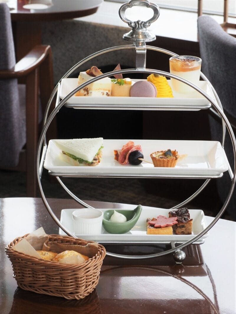 ゆったりとしたリラックスチェアに腰を下ろし、窓の外を眺めていると、ほどなくして3段のアフタヌーンティースタンドが登場。写真映えする可愛らしいスイーツと一口サイズの軽食がきれいに並んでいます。