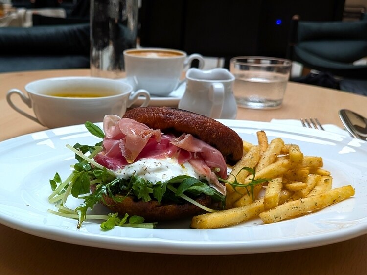 ランチメニューの一例。写真は程よい塩みの効いたハモンセラーノとヘルシーな野菜、軽やかなブリオッシュの食感も楽しい『ハモンセラーノとストラッチャテッラのブリオッシュドーナツサンド』とポテト、温製カボチャスープ