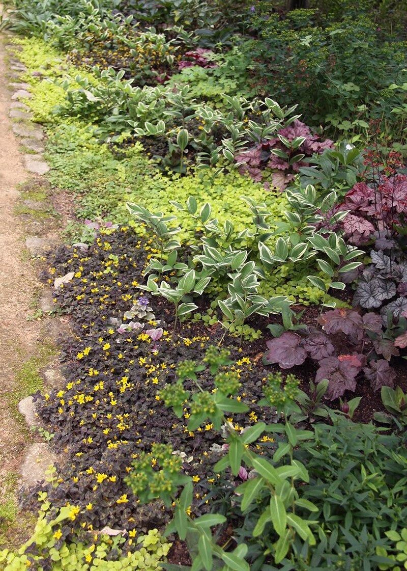 グラウンドカバーはリシマキアを2種、30〜40cmピッチで交互に配植して連続する二層帯に。明(オーレア)×暗(ミッドナイトサン)のコントラストが小径の輪郭を際立たせます。主役は斑入りアマドコロの白い線と赤葉ヒューケラの丸葉。形と色がぶつかる配置で奥行きが生まれ、初夏はアマドコロの白花やヒューケラの赤花が加わり、小径の表情が変わるのも魅力。