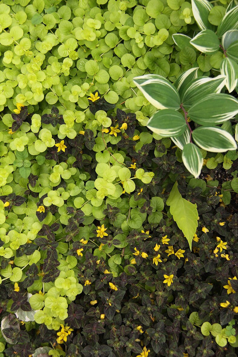 脇役&ベース:リシマキア・ヌンムラリア‘オーレア’(左上)、リシマキア・コンゲスティフロラ‘ミッドナイトサン’(右下)