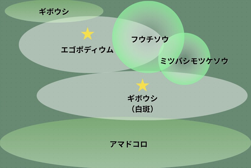 主役(図面★):白斑入りのギボウシ、エゴポディウム‘バリエガータ’